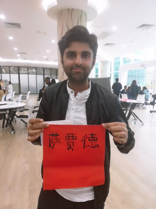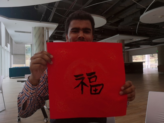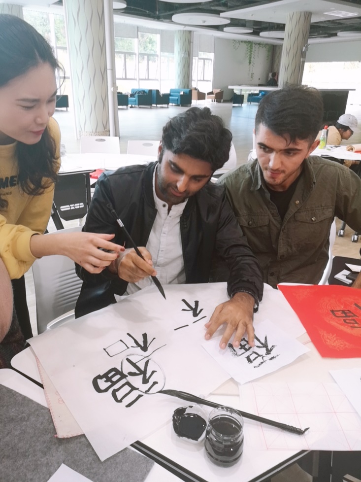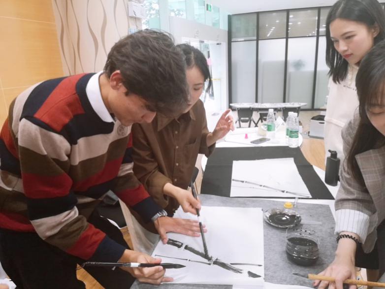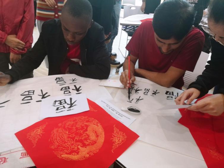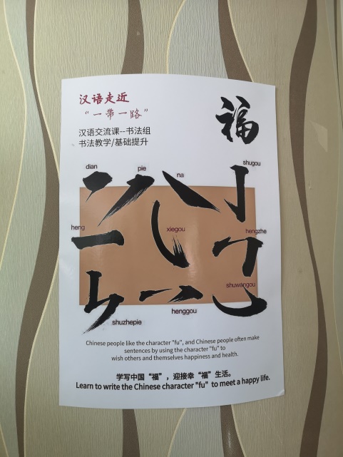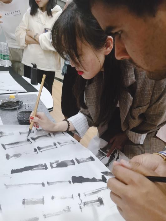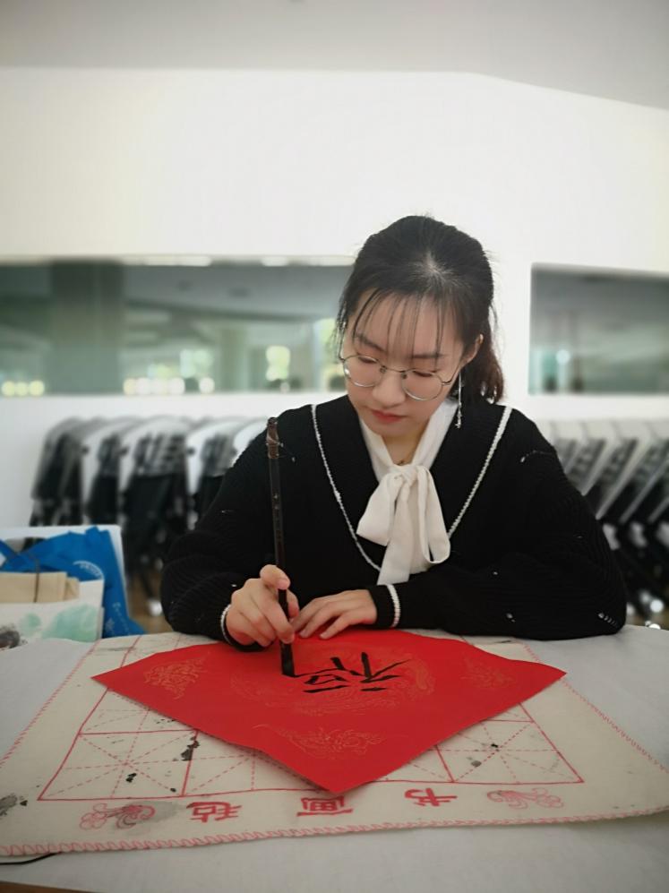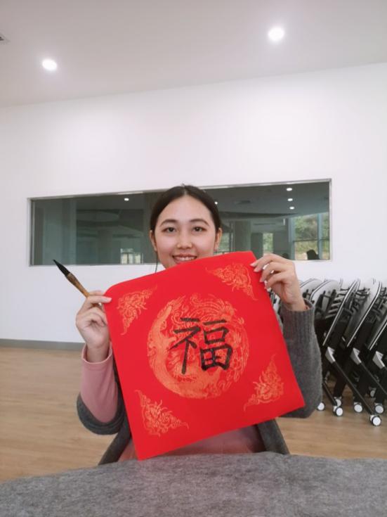汉字书法组精心准备了“福”字的书写教学。由书法组的同学示范,留学生兴致勃勃地临摹和学习,一笔一划慢慢地体悟方块字,而文化的底蕴就流淌在学生们的挥毫泼墨、笔走龙蛇之间。留学生们的“墨宝”可以自己带回去给同学和朋友展示,这让他们兴奋不已。