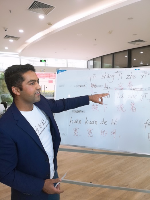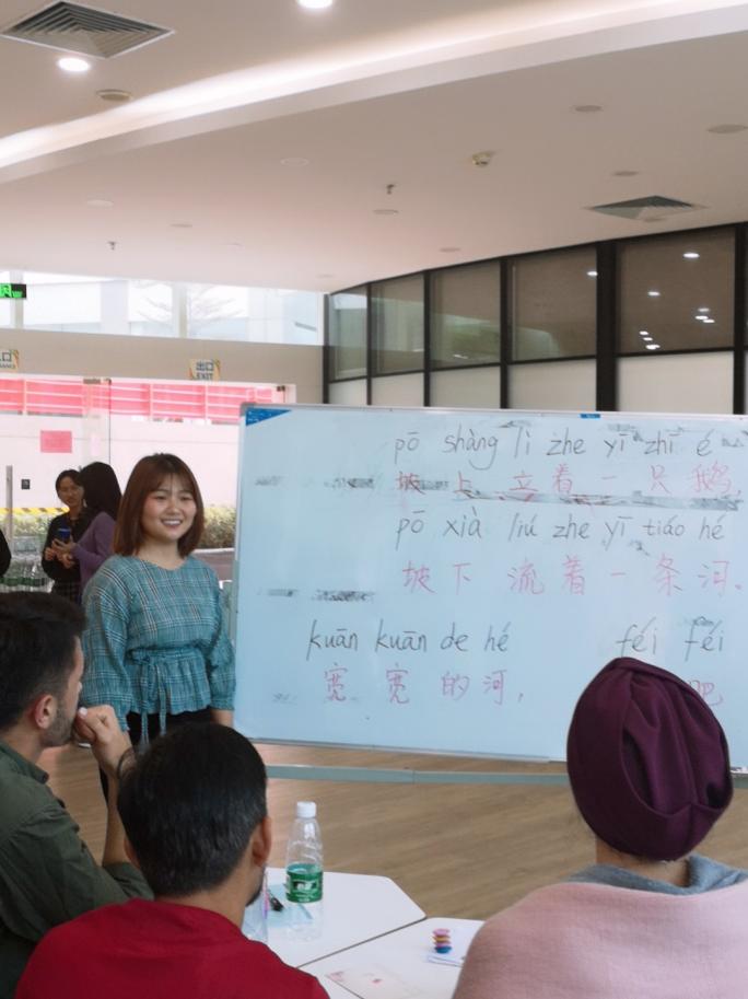语音组的教学内容诙谐有趣,以绕口令为切入点练习韵母“e”。同学们耐心地一点点纠正留学生的读音,可爱的留学生们舌头“打结”依然坚持发音练习,有个留学生“学霸”能读整段绕口令,还能翻译出大概的意思……他们让语音的课堂鲜活起来,中外学生不断地发现问题并解决问题,共同进步。