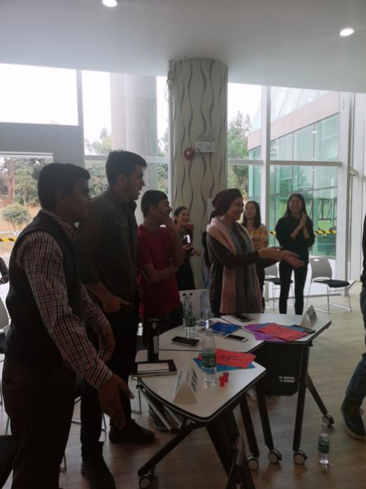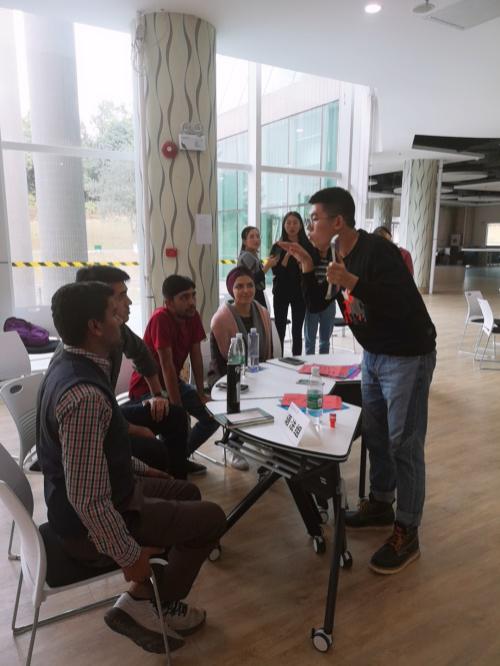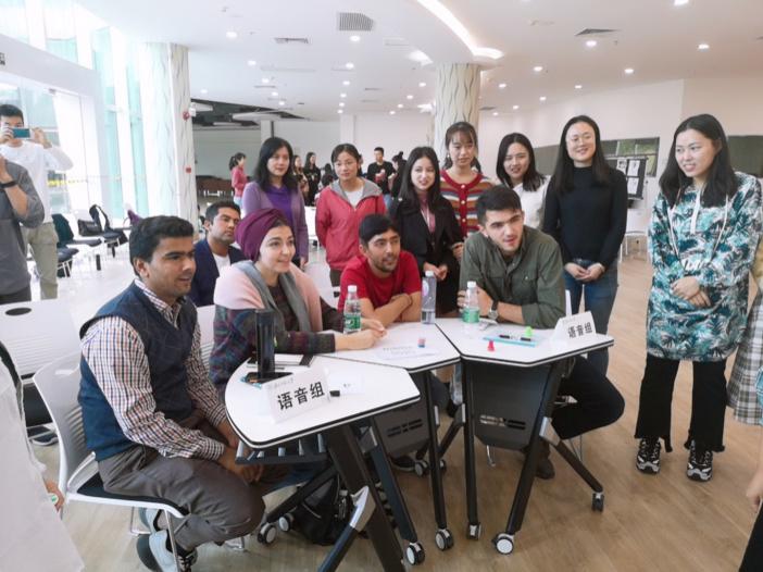 两个学院的学生相互自我介绍后,第一轮学习交流会以语法、交际、语音组为中心进行讲解和交流。