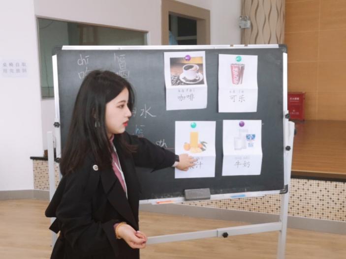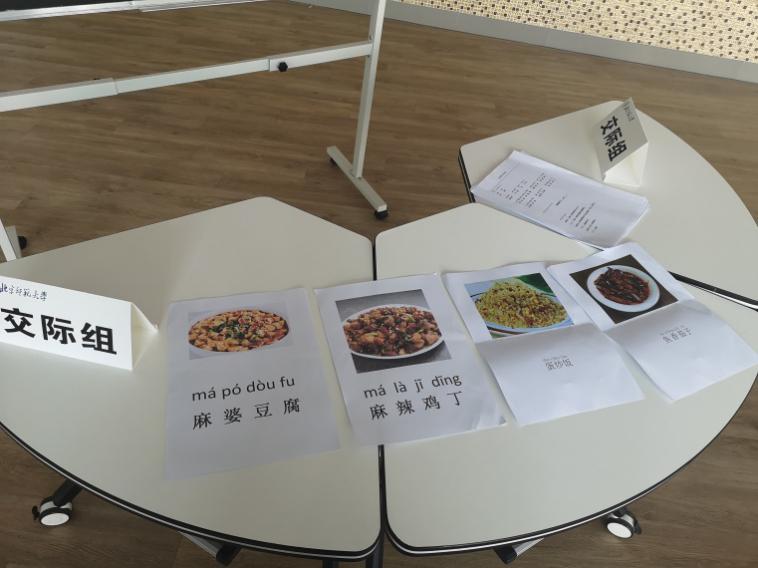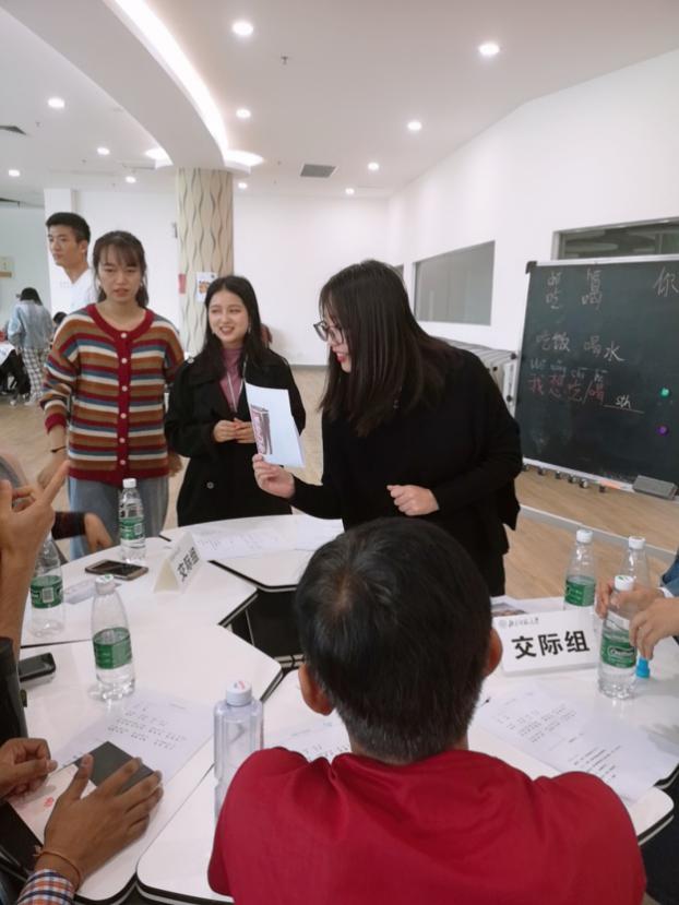 交际组的话题是“饮食”,留学生们对各式各样的中国菜兴致勃勃。交际组的同学在设计和实施时兼顾知识性和实用性,通过不断地与学生对话加强留学生们对“牛奶”“咖啡”“果汁”等饮品以及“麻辣鸡丝”等中国菜的印象。留学生们主动且积极地与交际组的同学们沟通,锻炼他们的汉语交际能力。