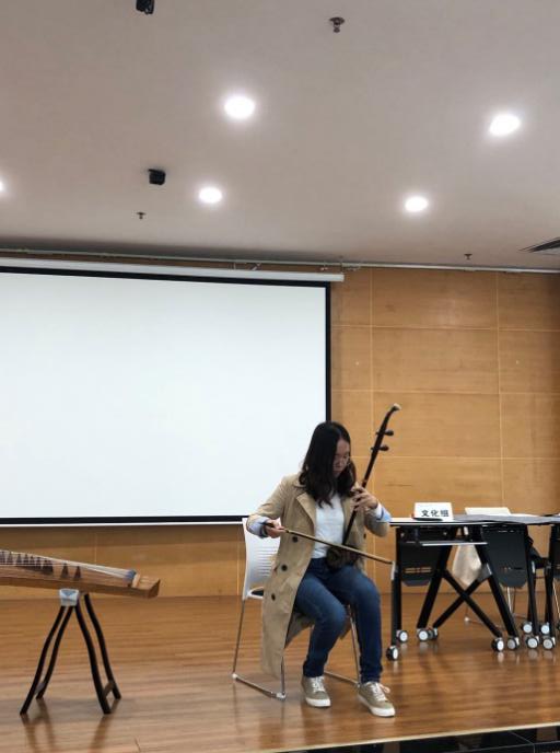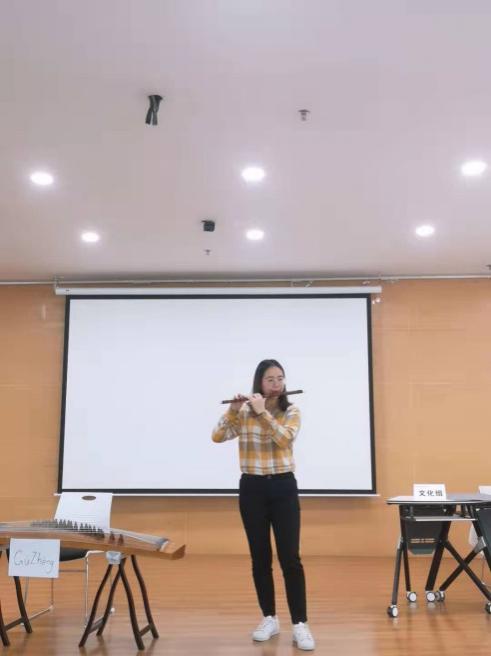 文化组的三位同学首先介绍了自己使用的民乐,然后向留学生展示才艺,包括宛转悠扬、愁肠百转的古筝独奏《乡韵》,热烈欢腾的笛子独奏《金蛇狂舞》以及大气磅礴、奔腾嘶鸣的二胡独奏《赛马》。留学生们沉醉在中国民乐的音乐创造力和表现力中,无形间缩短了与中国文化看似遥远的距离。