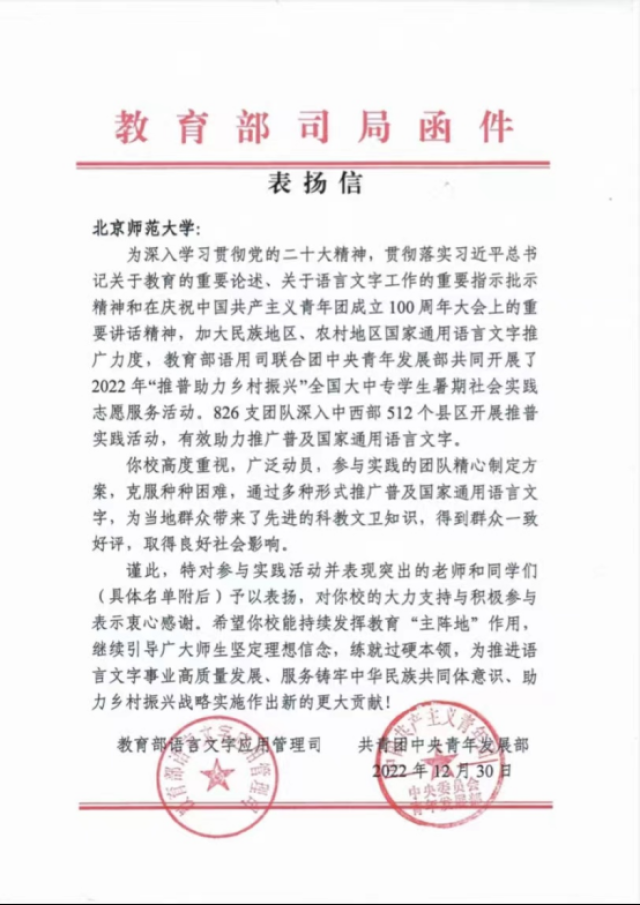 近日,教育部语言文字应用管理司、共青团中央青年发展部发来表扬信,对我院“百廿师大,推普助力乡村振兴”实践团队2022年暑期在参与教育部语言文字应用管理司联合共青团中央青年发展部开展的2022年“推普助力乡村振兴”全国大中专学生暑期社会实践志愿服务活动的积极贡献给予表扬。