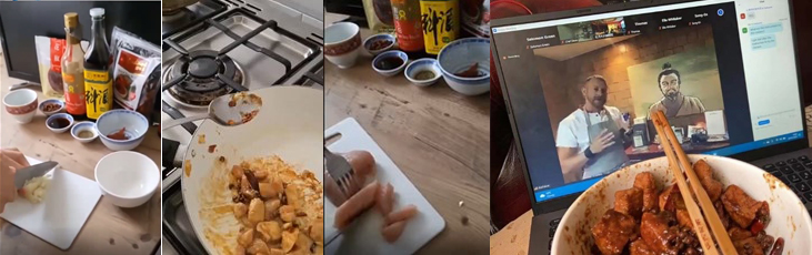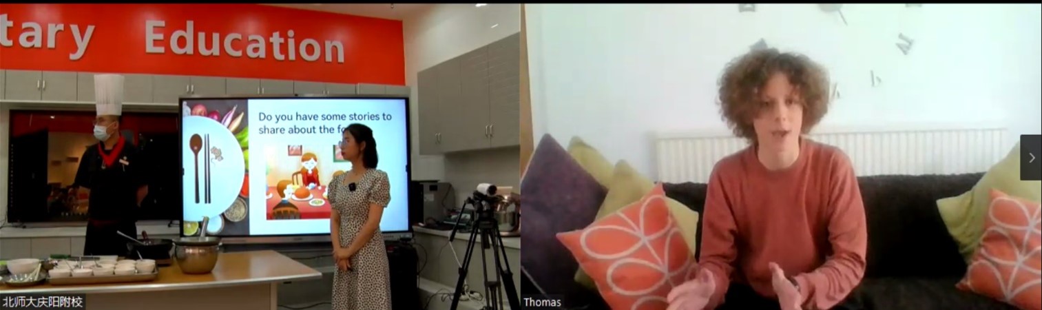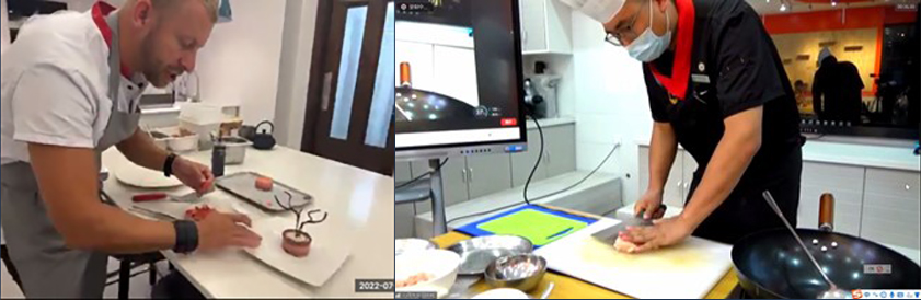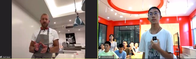 在美食主题中,庆阳附校的老师讲授中华美食方面的知识,并由技能教师在学校餐厅进行现场教学,教授“宫保鸡丁”的制作方法。英方营员跟随中方教师,一步一步学着制作宫保鸡丁。英方利物浦鲁班饭店的Dave主厨实境介绍鲁班饭店的中国文化元素,并现场制作融合中华文化特色的甜点。展示讲解之后,中英双方营员现场连线主讲教师,进行讨论交流。
