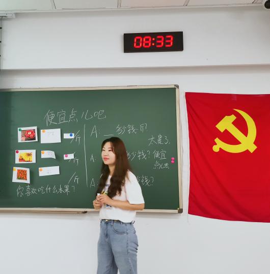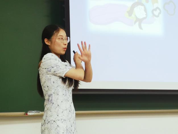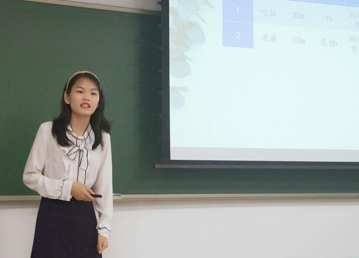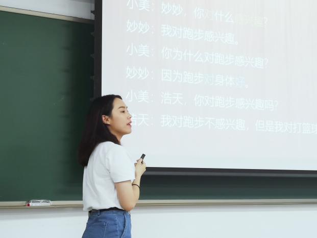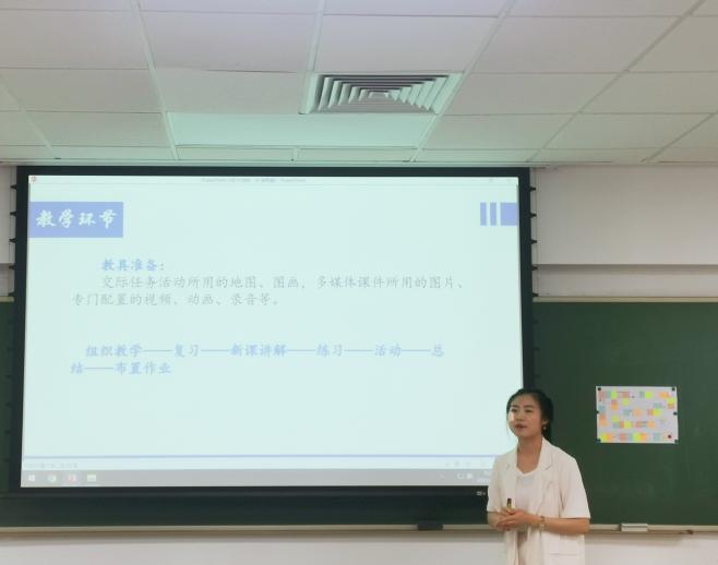 决赛开始前,工作组成员一早便来到励教楼布置比赛现场,为比赛的顺利进行做好一切准备。上午八点,主持人李亚敏、张诗涓致开场词,欢迎各位评委老师、参赛选手及观众的到场,并宣布比赛正式开始。19位选手依次上场,每人10分钟展示时间,其中说课2分钟、试讲8分钟。每位选手的试讲都十分精彩,他们或借助词卡、图卡、视频和音频辅助教学,或采用说唱、唱歌等活泼的方式讲授语言点,或在教学中设计各种有趣的游戏和操练活动。五位评委老师对每一位选手的教姿教态、环节设计、教师语言等方面都给予了专业的点评。