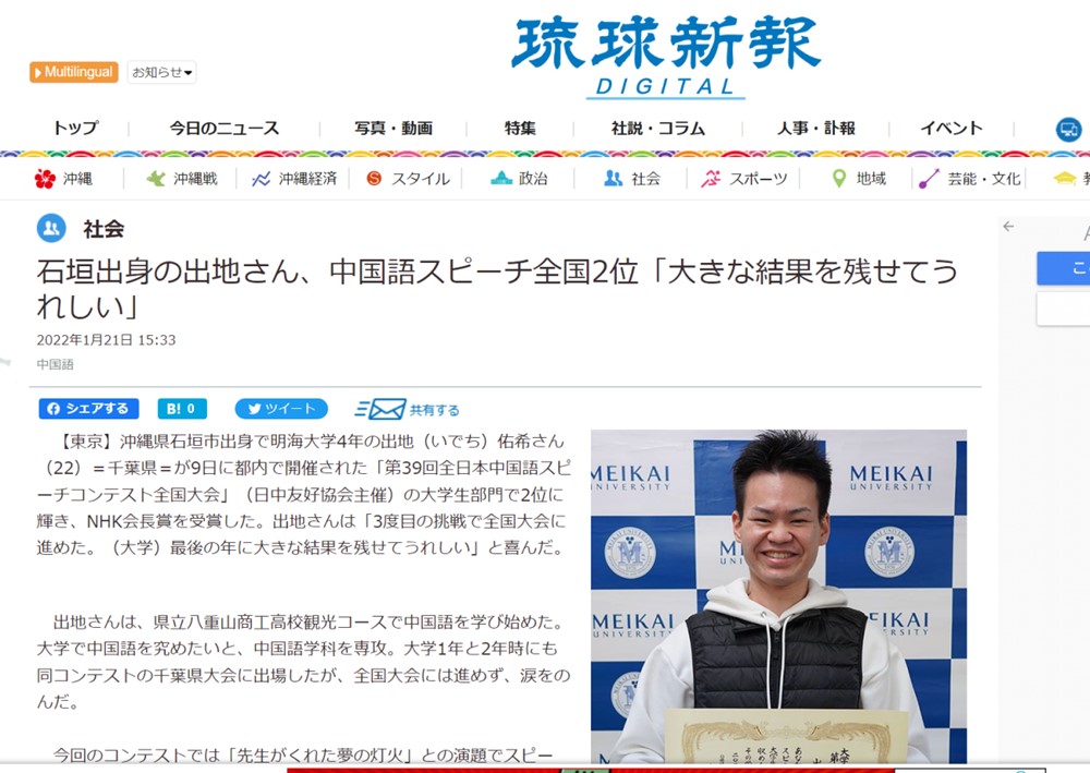 1月12日,中国语学科四年级学生出地佑希同学在由日中友好协会主办的第39届全日本中国语演讲大赛上夺得大学生组第二名,并荣获日本全国广播协会(NHK)会长奖。今年22岁的出地佑希同学在冲绳县读高中时就开始学习汉语,大学时他又选择了中国语学科。在本次全国大赛中,出地以“老师给我梦之灯火”为题,用流利的汉语表达了对恩师八重山商工高中汉语老师石垣丽子的敬意,展露了自己想成为一名汉语教师的热切愿望。出地同学获奖后,消息迅速传遍了整个校园,也传回了他的家乡冲绳。不久,他获奖的消息就登载到了当地的报纸《琉球新报》上。