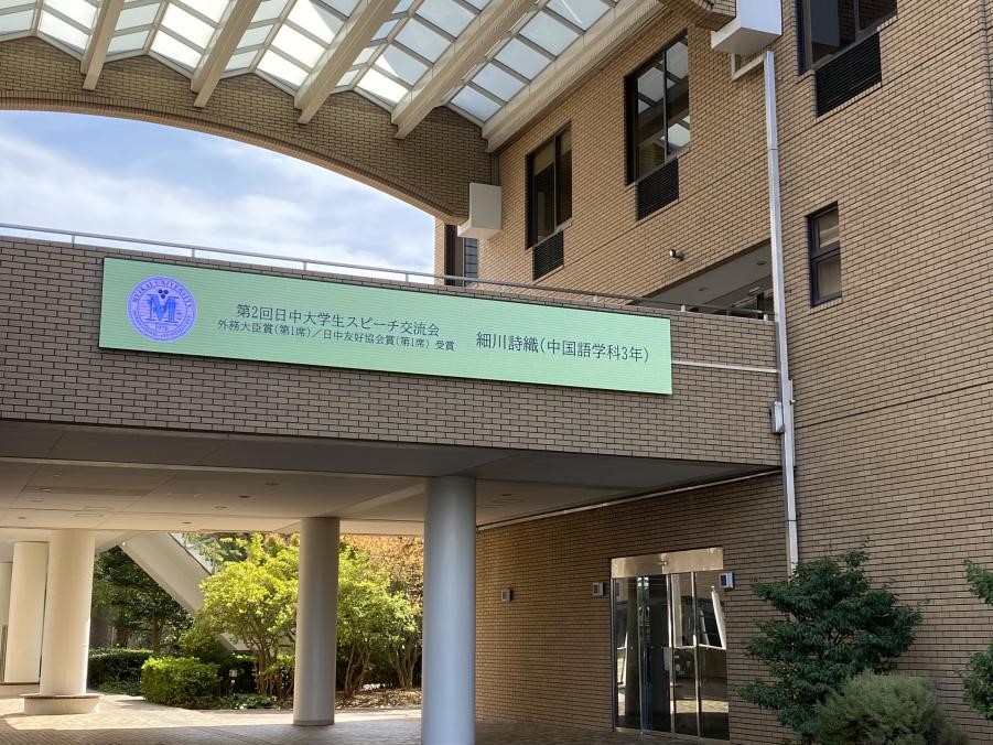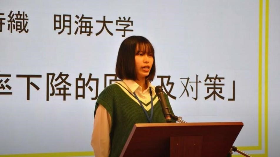 细川同学今年参加了两个大赛。2022年10月22日,她在第2届日中大学生演讲交流会上获得外务大臣奖第一名和日中友好协会奖第一名。这次比赛由日中友好协会主办,主办方从日本全国遴选出12名日本大学生和12名中国留学生组成对子,之后这一对对选手将进行3个月的在线交流,练习、准备,然后在正式比赛中展示并竞争。细川同学与名古屋大学的中国留学生张翔喻同学成为一对组合,她们合作进行了“日中两国出生率下降的原因及对策”的演讲,夺得了冠军。