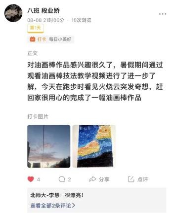在课堂之外,实践队员们还别出心裁地设置了“14天小打卡”活动,鼓励同学们记录并分享暑假的精彩片段,通过打卡的形式养成良好的学习及生活习惯。打卡小程序共设置了“每日小美好”“朗诵打卡”“英语单词打卡”“运动打卡”“阅读打卡”五个小板块,内容涵盖学习、运动、生活各个方面,由学生们自主选择一个或多个板块进行打卡。学生们积极参与,十分热情。以打卡小程序为平台,将师生互动延伸到课外,更大程度上增进了师生之间的相互了解。