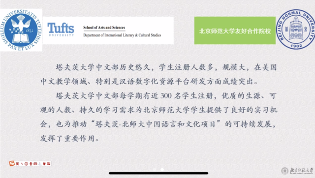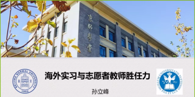 最后,孙立峰老师从项目简介、实习岗位、工作内容、注意事项四个方面对“塔夫茨大学——北京师范大学实习项目”进行介绍,鼓励同学们踊跃参与教育实习,为日后的专业发展奠定基础。