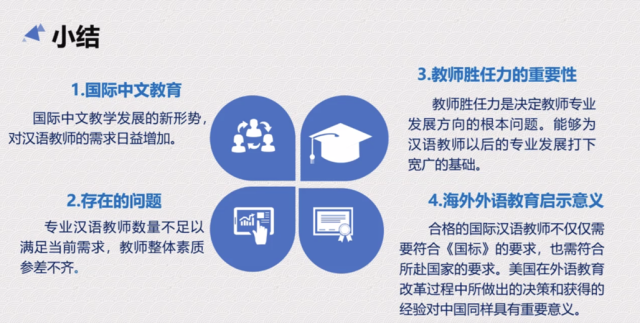 随后,孙立峰老师通过塔夫茨大学孔子学院宣传片,结合自身日常工作为同学们讲解海外实习的主要工作内容。她指出在后疫情时代的影响下,汉语在线教学逐渐兴起,这对国际中文教育提出了新的挑战,也对海外实习提出了更高的要求,意味着教师胜任力也需要进一步提升。孙老师继而结合个人教学经历、具体案例及相关调研数据指出,汉语教师要开展本土化的中文教学。下面,通过对美国《外语教师培养标准》与英国《教师标准2012》的介绍,她提出国际汉语教师要从基本胜任力和鉴别胜任力两方面提升教师胜任力,要明确未来的职业规划,要提高海外教学能力,要全面提升个人的综合素养。