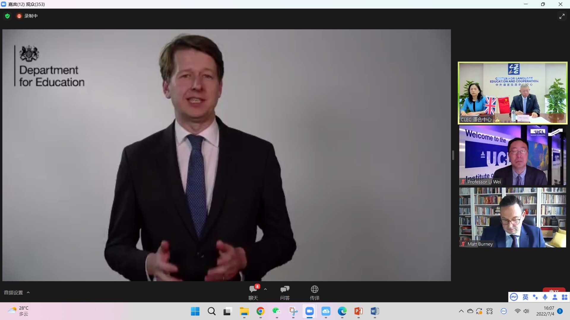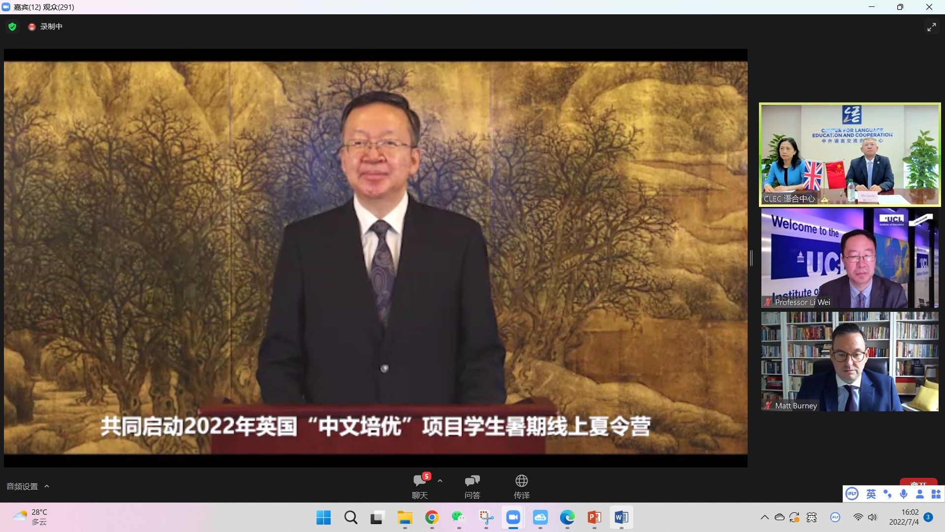 7月4日,2022年“汉语桥”英国“中文培优”项目学生在线夏令营开幕式成功举行。开幕式由中外语言交流合作中心主任马箭飞主持,中国教育部副部长田学军、英国教育部学校事务部长罗宾·沃克(Robin Walker)、英国驻华使馆文化教育公使/英国文化教育协会中国区主任包迈岫(Matt Burney)、伦敦大学学院教育学院院长李嵬出席并致辞。此外,还有来自英国64所培优学校和16所中国参与机构的近2000名师生一同参加了开幕式。