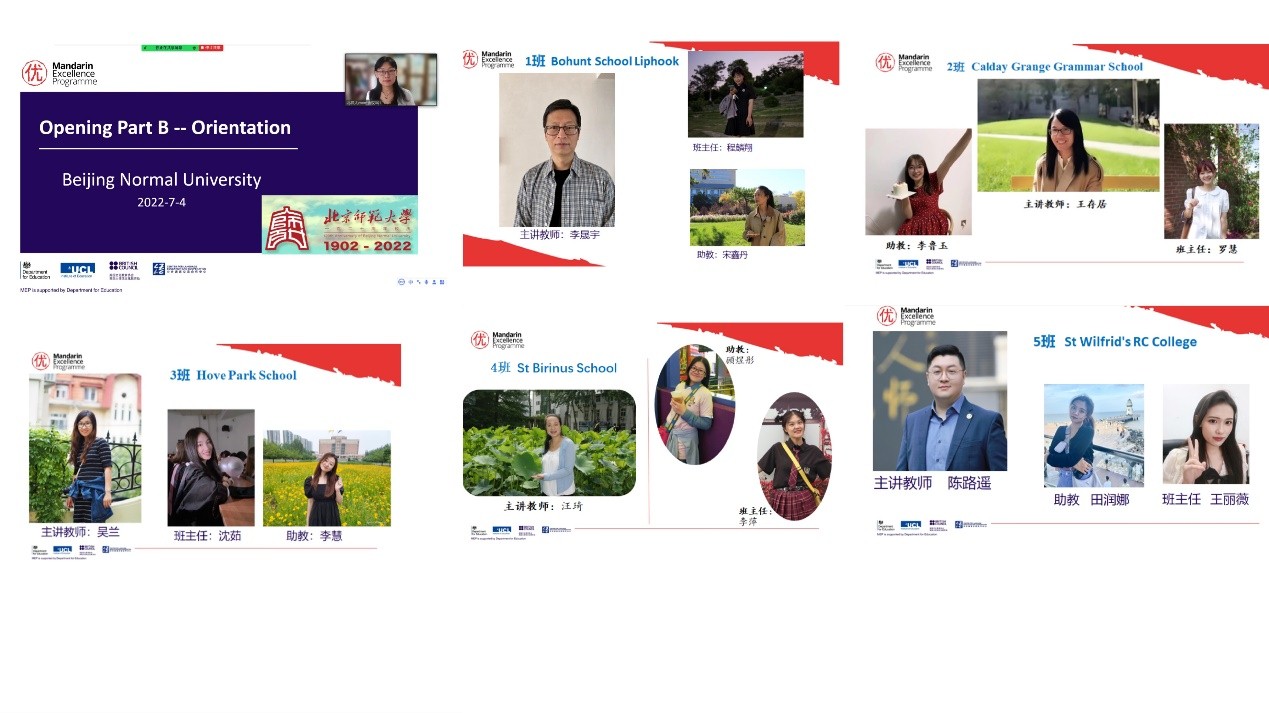 全体开幕式之后,北京师范大学分会场开营指南环节由学校该项目负责人国际中文教育学院教师李娜主持。北师大作为承接此项目的16所中方院校之一,为对接的五所英国学校配备了优质的教师团队、助教团队、班主任团队,以及来自北师大南山附属学校的中国语伴团队。