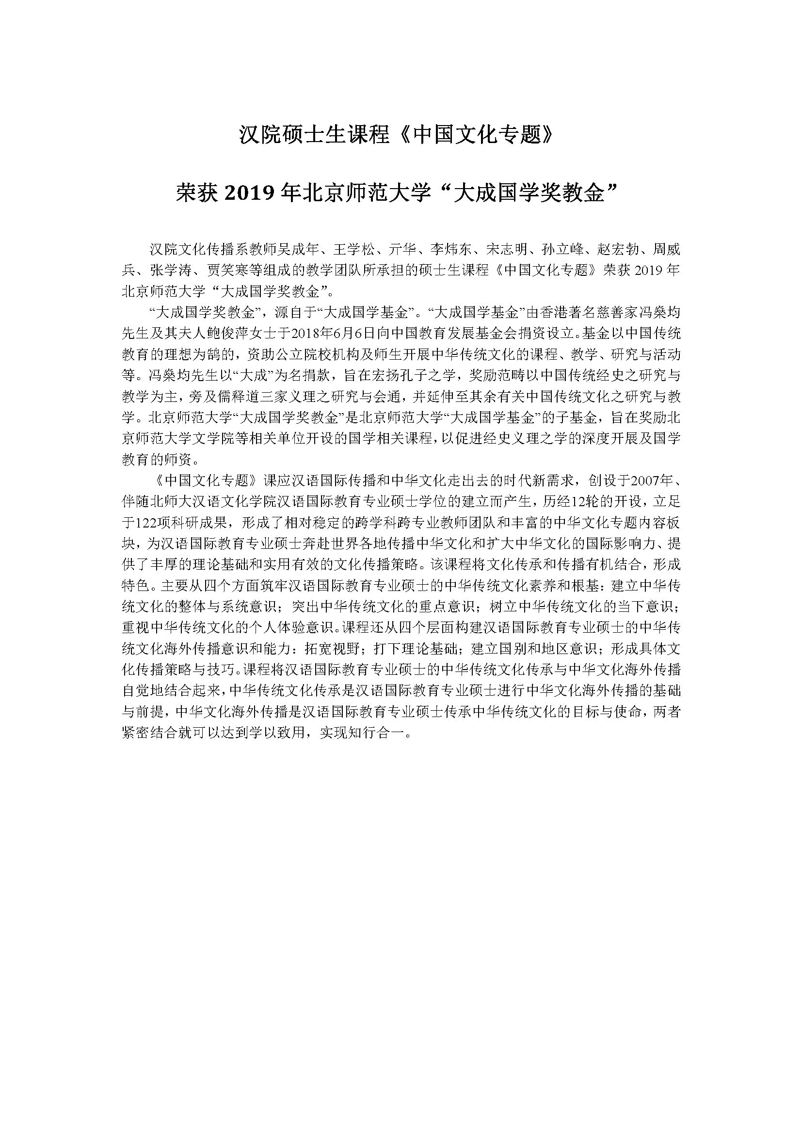 汉院文化传播系教师吴成年、王学松、亓华、李炜东、宋志明、孙立峰、赵宏勃、周威兵、张学涛、贾笑寒等组成的教学团队所承担的硕士生课程《中国文化专题》荣获2019年北京师范大学“大成国学奖教金”。