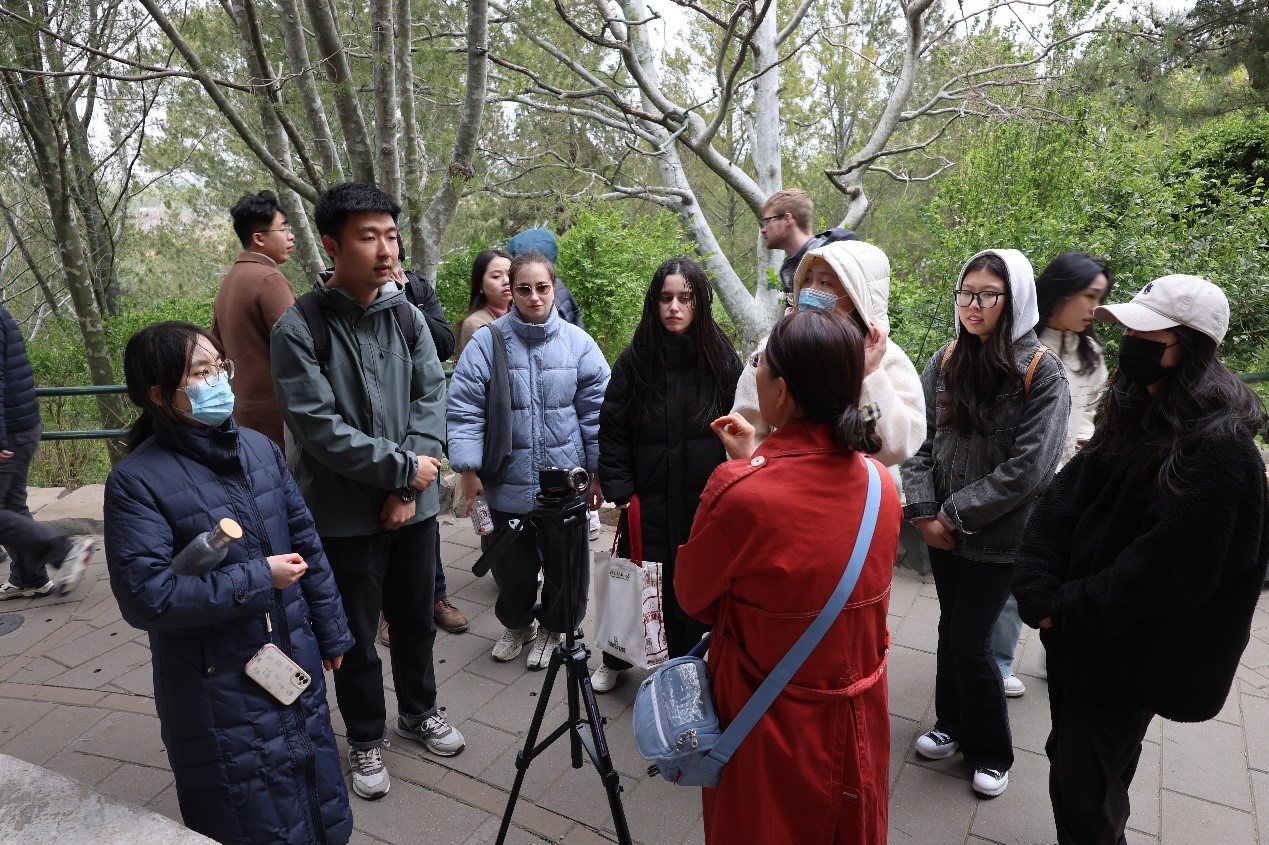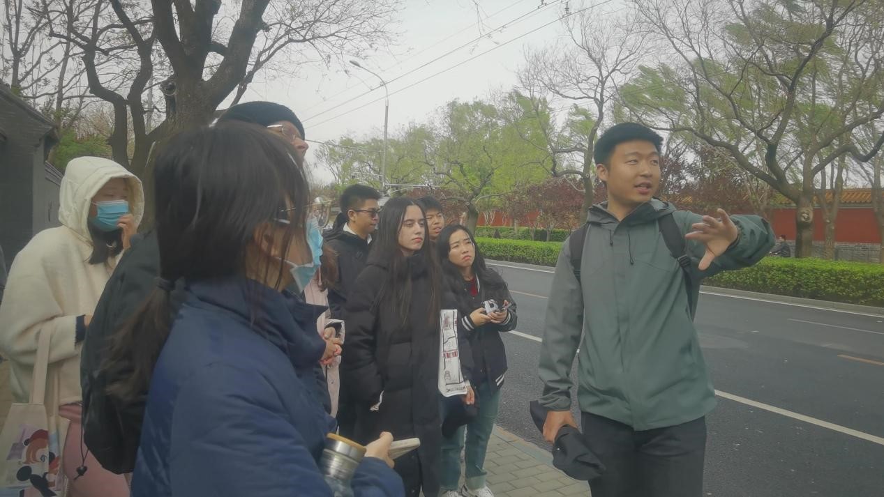 “北京中轴线”共包含15处遗产构成要素。4月13日下午,学生们从中轴线北端的钟鼓楼出发,向南经万宁桥,登景山,绕故宫,穿天安门广场及建筑群,行至正阳门,用脚步丈量中轴线上的遗产点。沿途经过南锣鼓巷街区、烟袋斜街、米粮库胡同、黄化门、地安门市场等北京胡同及街区,所到之处让同学们不仅对北京城历史规划及现代布局开展深度学习,还从更多维度了解到北京“中和”之美、“秩序”之美以及“日常”之美。