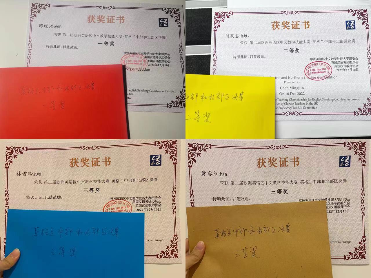 最终经过激烈的角逐和评委老师们的认真评议,下午三时许,裁判长朱珠老师宣布比赛结果。曼彻斯特大学孔子学院的名字四次被提起,志愿者教师陈晓语独享一等奖,陈明君独享二等奖,林雪玲和黄睿红并列三等奖。四位老师将代表英格兰中部和北部区参加第二届全英汉语教学技能大赛总决赛。