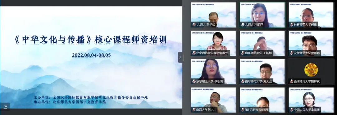 8月4日至5日,汉语国际教育专业硕士核心课程“中华文化与传播”师资培训在线举行。本次培训由全国汉语国际教育专业学位研究生教育指导委员会(教指委)主办,北京师范大学国际中文教育学院承办,来自全国127所汉语国际教育硕士专业学位培养院校的208名课程专任教师参加培训。