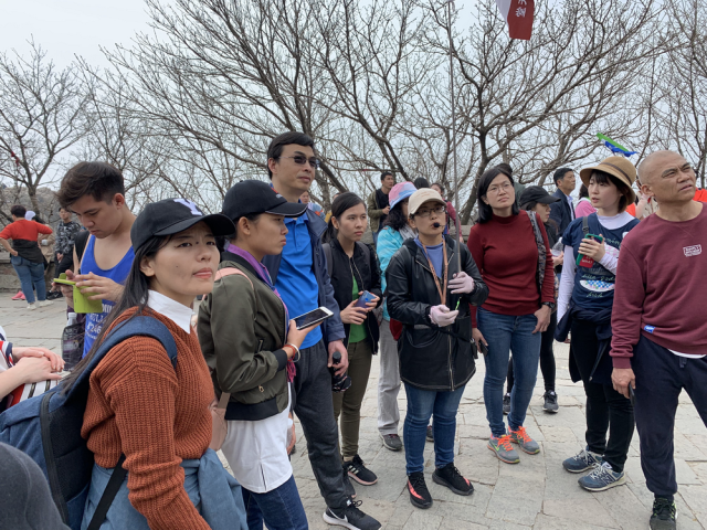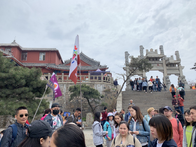 第三天早上,“中国概况”军团到达了泰山脚下,开始了令人神清气爽的登高之行。前往南天门的途中,同学们在观光车上领略了巍峨泰山的另一面,山路蜿蜒曲折,春日的花朵和青松互为点缀;在直入青天的索道缆车上,山间的鸟儿向同学们讲述着岱宗的清秀。恐高的同学和登山爱好者在缆车车厢内欢声笑语,不一会,大家就到了中山门。
