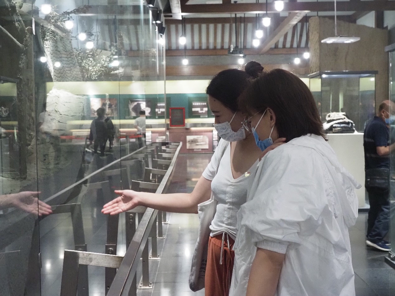 随后,党员同志们参观了地道遗址,从展览馆前往地道遗址的路上,一架古旧的飞机残骸停在展馆外的一处空地上,我们已经很难想象在当时飞机空袭下的场景。而地道,作为焦庄户人民躲避空袭的藏身场所,发挥了重要作用。长长的地道是以焦庄户村为中心,北至大北坞村,南至龙湾屯村、唐洞村,全长23华里,形成一条“能走、能藏、能打、能防”的“战略型”地道网。地道内设有翻板、陷井、射击孔、掩体等大量的防御型设施和战斗型设施,可谓“麻雀虽小但五脏俱全”。昏暗的灯光、阴冷的环境、逼仄的空间,大家深刻地体会到了当年抗战的艰辛与先烈们的英勇付出。