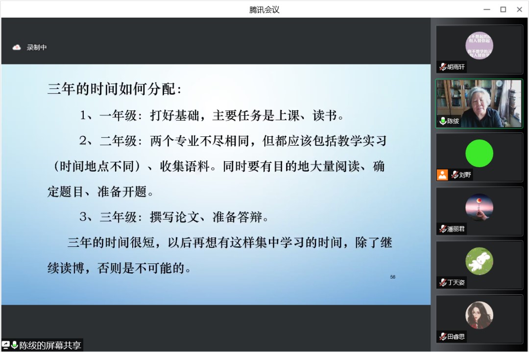 对于如何成为一名优秀的研究生,陈绂老师建议大家要科学合理地规划好、利用好研究生学习的三年时光。明确自己的目标,明晰每个阶段的主要矛盾,在不断读书学习中提高自身素质和修养。在讲座中,陈绂老师结合自身经历,幽默风趣地分析了汉语教师可能遇到的问题。在引人深思的同时,也极大激发了大家对未来学习生活的向往。