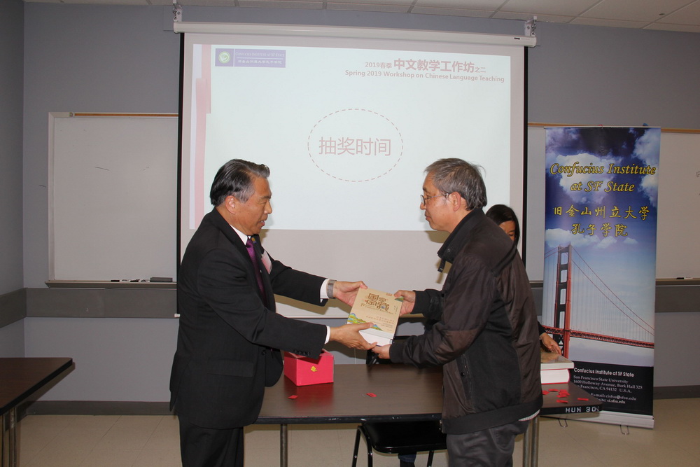 最后,旧金山州大孔院还为工作坊参加者组织了抽奖活动。谢家新、冯丽萍两位院长为中奖者颁发了教学参考书籍、词典等奖品。工作坊接近尾声时,冯丽萍教授介绍了州大孔院即将主办的中文教学暑期培训班活动以及秋季中文教师工作坊等项目,欢迎大家继续参加。