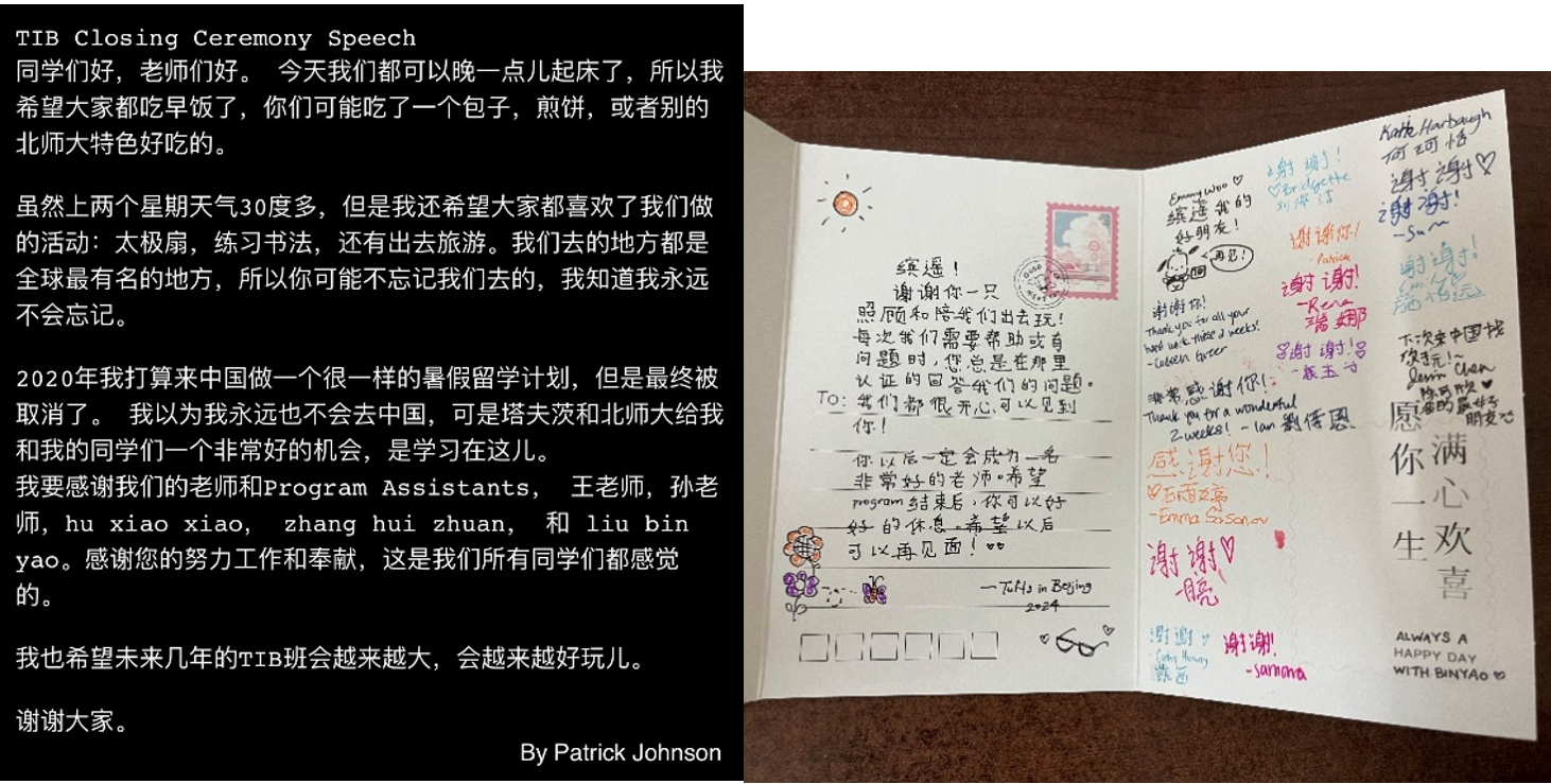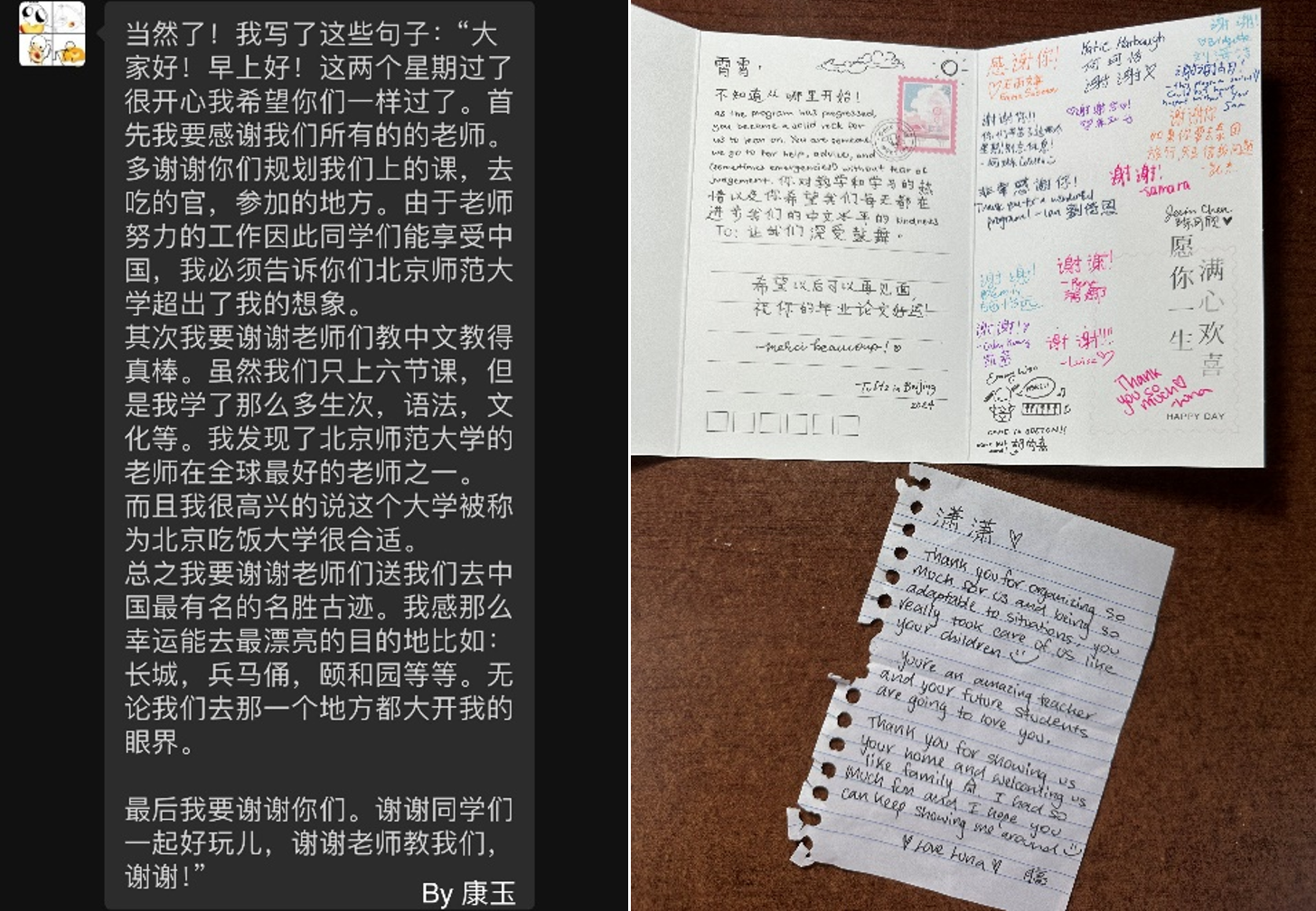 学生们在结业仪式上的发言和给老师们的感谢信