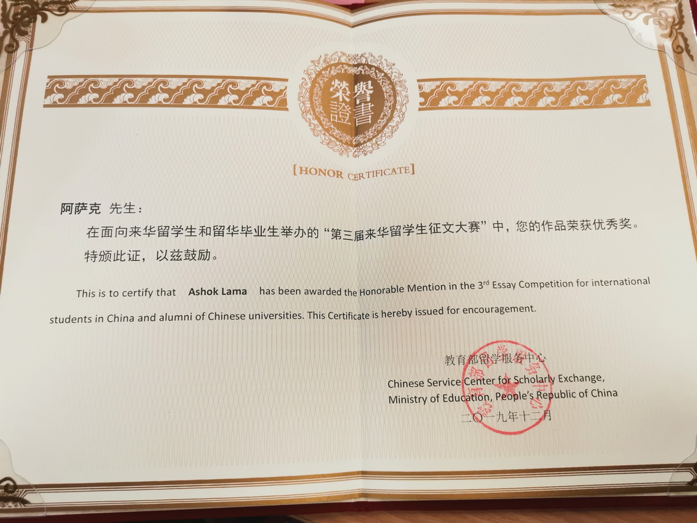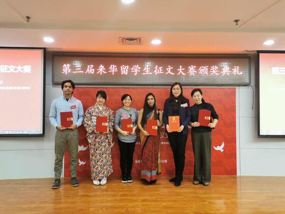 2019年12月20日上午十点整,教育部第三届来华留学生“我与中国的美丽邂逅”系列征文大赛颁奖典礼在教育部留学服务中心十层报告厅隆重举行。据悉,此次征文大赛从2019年五月开始,为了展现中华人民共和国建国70年以来的辉煌成就,促进不同国家青年一代的人文交流,增进外国留学生知华、友华的情怀和对中国发展变化的深刻认知,面向全国各大高等院校在读留学生以及毕业留学生征稿。大赛一共收到来自一百多个国家的670多篇投稿。