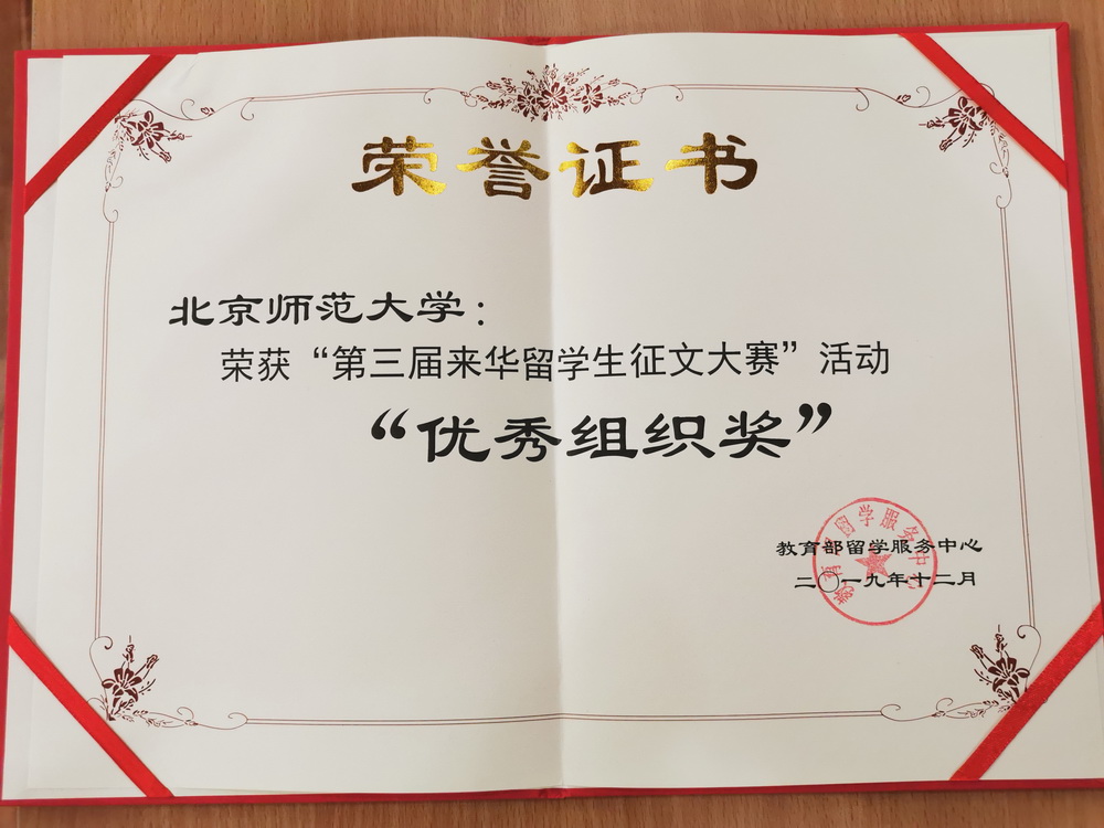 经过专家们的严格评选,最终共有5名留学生获得一等奖,8名留学生获得二等奖,16名留学生获得三等奖,30名留学生获得优秀奖。其中北京师范大学汉语文化学院的吴芮慈同学(指导教师徐棠)荣获二等奖,池田诗贵同学(指导教师张娇)荣获三等奖,阿萨克同学(指导教师黄晓琴)、林美丽同学(指导教师吴方敏)、大海同学(指导教师柯航)荣获优秀奖,共计5名学生荣获此次征文大奖。同时北京师范大学荣获此次征文“优秀组织奖”。所有获奖作品由人民日报出版社集结成书出版。