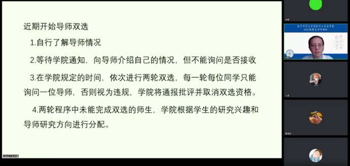首先,柯老师向同学们详细介绍了新学期的上课时间和导师选择流程。柯老师提醒同学们及时关注学院通知,提前了解导师信息,并按照程序进行双选。对于未能完成双选的学生,学院会根据学生兴趣和导师研究方向进行分配,以保证每位同学最后都能有自己的导师。