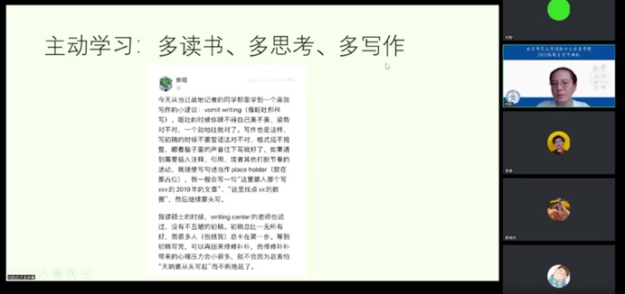 关于学习,柯老师提出了“主动学习”的建议。柯老师指出,研究生学习不同于本科,它更看重学生自主学习和研究能力的培养。所以,在研究生阶段,大家更应该注重培养自己的研究意识,主动学习,多读书、多思考、多写作,为今后的职业生涯奠定基础。