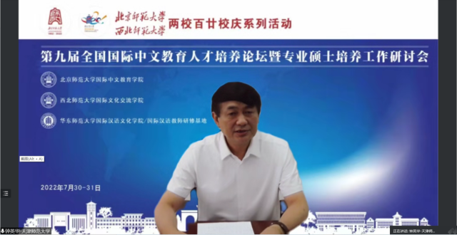 恰逢北京师范大学一百二十周年校庆之际,为进一步推进国际中文教育专业硕士培养工作,加强国际中文师资队伍建设,促进国际中文教育事业的发展,北京师范大学国际中文教育学院、西北师范大学国际文化交流学院、华东师范大学国际汉语文化学院/国际汉语教师研修基地于2022年7月30-31日联合举办了第九届全国国际中文教育人才培养论坛暨专业硕士培养工作研讨会。