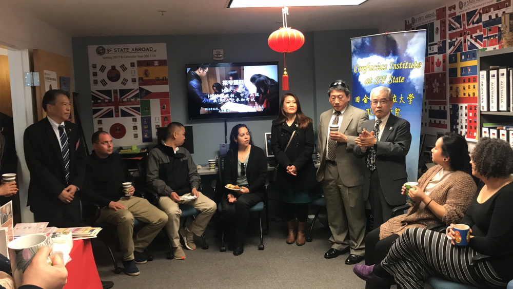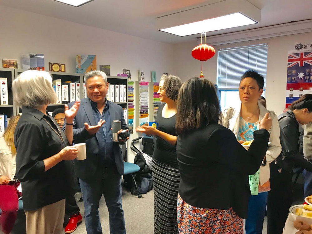 美国当地时间3月28日,旧金山州立大学孔子学院在国际部办公区承办工作早餐会(Coffee Social ),学校主管学生事务的副校长洪乐乐(Luoluo Hong)、分管国际教育交流的协理副校长吴彦伯(Yenbo Wu)、与学生事务相关的近十个行政部门以及孔子学院的人员共50余人参加。