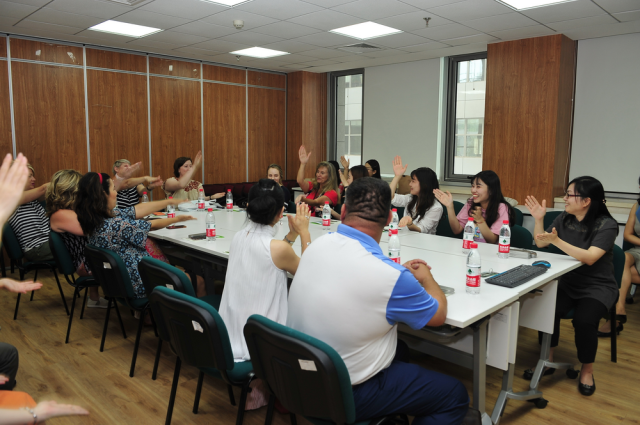 汪珍珠老师向访问团的老师们全面介绍了汉语文化学院的办学情况,介绍了汉院的合作项目、非学历和学历的培养项目等。