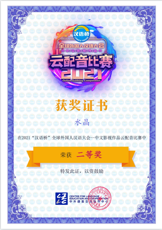 3月18日,2021年“汉语桥”全球外国人汉语大会——中文影视作品云配音比赛获奖名单新鲜出炉了。我院来自俄罗斯的水晶同学在此次比赛中表现优异,她的配音作品《七月与安生》受到专业评委老师的高度评价,荣获欧洲组二等奖。