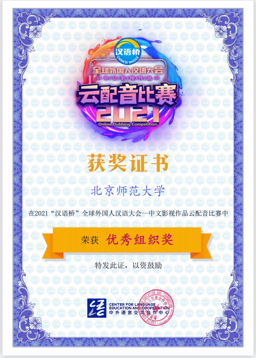 学院领导高度重视此次比赛,组织老师在各班宣传并鼓励学生参加,学生们热情高涨,踊跃报名。为了帮助学生通过比赛提高汉语水平,增进对中国的了解和理解,获得更好的成绩,学院专门组织本院有丰富配音经验的中国学生,为参赛留学生做一对一的指导,最终有26名留学生参与了该项比赛,共提交了34个配音作品。比赛结果也十分骄人,除水晶同学斩获二等奖以外,其余同学均获优秀奖。由于组织有力,北京师范大学也荣获优秀组织奖。
