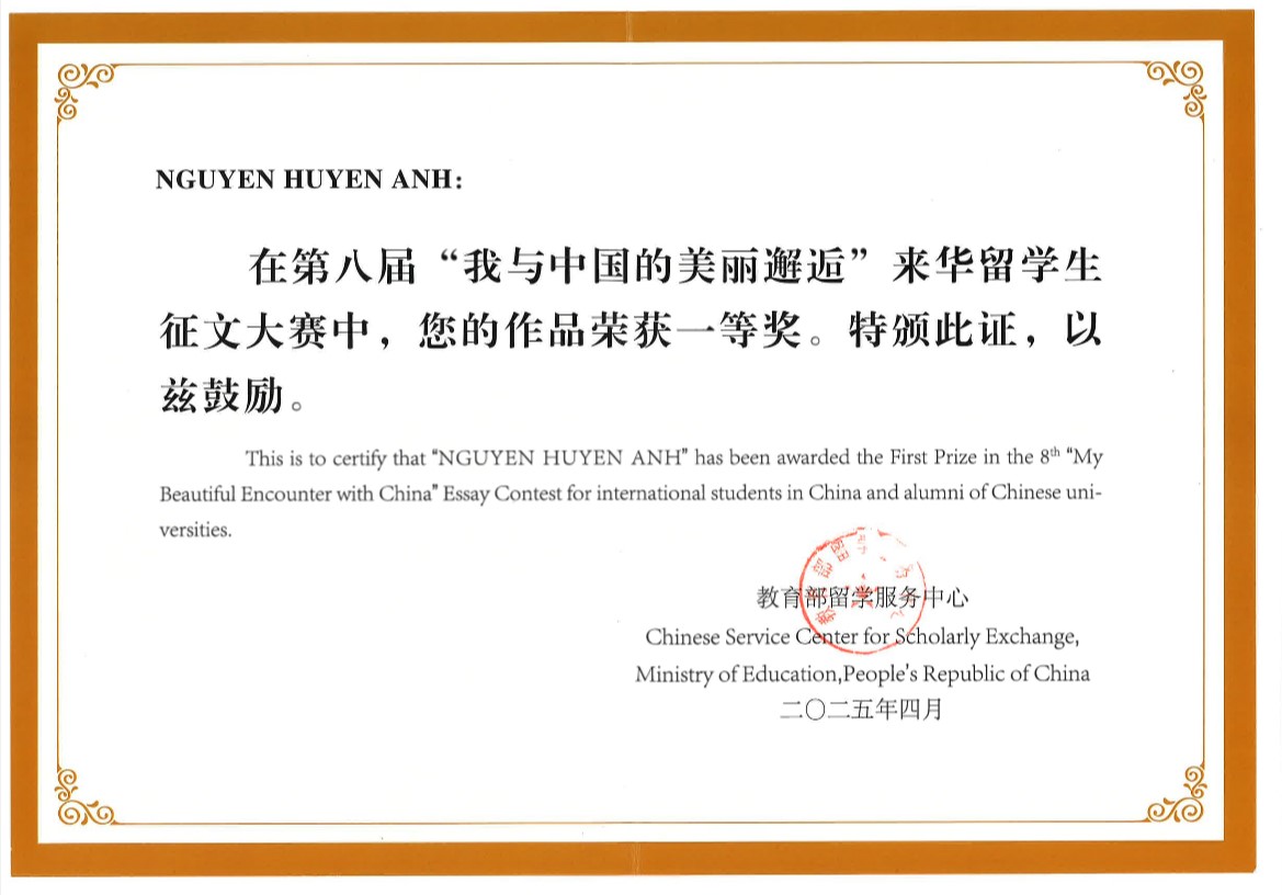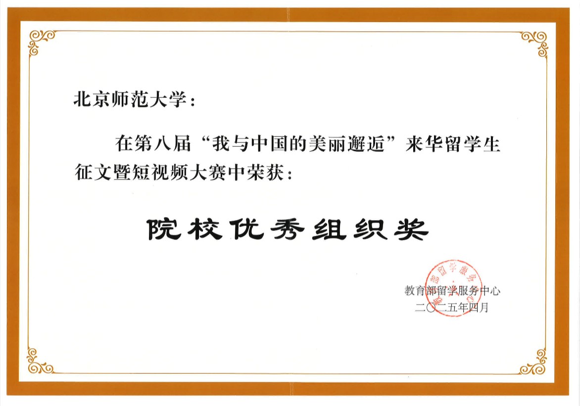 2025年4月11日,由中国(教育部)留学服务中心主办的2025中国留学论坛(CSAF)——“留学中国与世界”专题研讨活动在北京国家会议中心成功举办。活动现场为“我与中国的美丽邂逅”获奖学生代表颁发证书,并同期发布了《2024年来华留学生征文大赛优秀作品集》。我院越南籍学生阮玄英(NGUYEN HUYEN ANH)的征文作品《一封“情书”》获大赛一等奖,其作品被刊登在人民日报出版社出版的《我与中国的美丽邂逅——2024来华留学生征文大赛优秀作品集》中,我院教师孙红娟获“优秀指导教师”奖,北京师范大学获“优秀组织奖”。