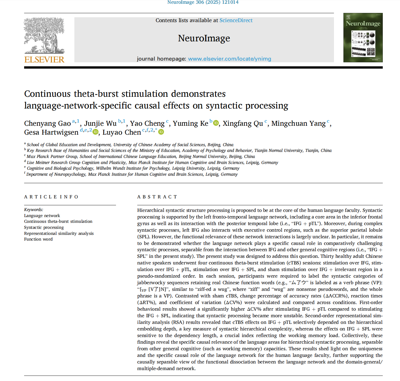 成果速递丨陈路遥:连续Theta爆发式经颅磁刺激首次揭示句法加工中语言网络的特定致使效应